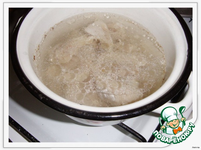 Бросить в бульон(в воду) 1 ч.л. молотой куркумы, немного соли, 1 лавровый листик и 5-6 горошинок чёрного перца.