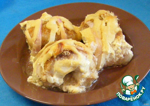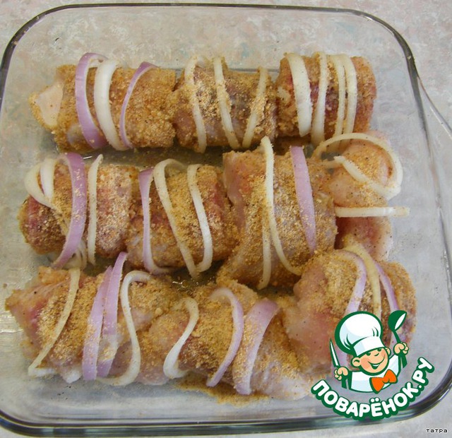 Каждый кусочек солим,перчим,скручиваем рулетиком.Обваливаем в сухарях.На каждый кусочек одеваем кружочки лука.Чтобы не нарушить панировку,кружочек лука надсекаем.