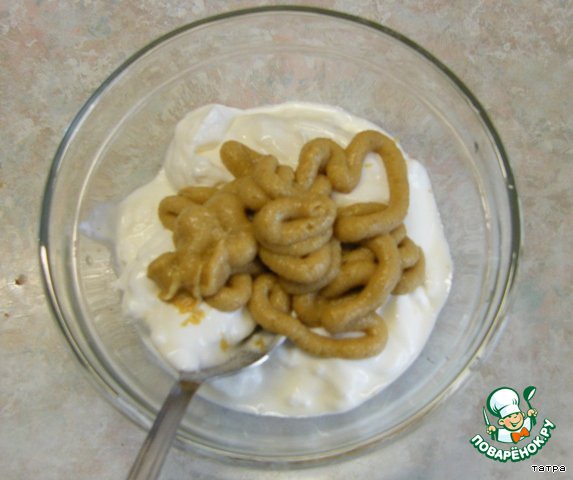 Заливку наносим на рыбу,я сделала это с помощью кулинарного мешочка.Если кто любит поострее можно сверху поперчить.