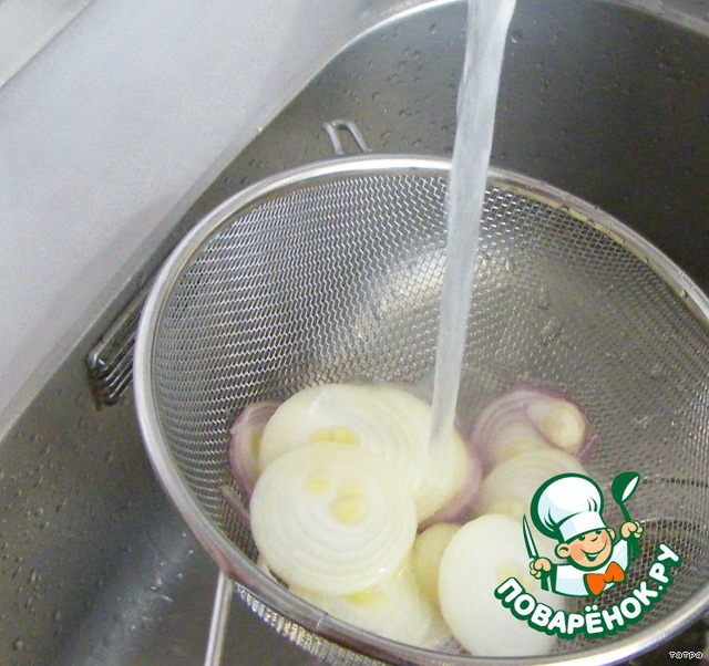 Лук режем кольцами и обдаем кипятком,чтобы вышла горечь и лук стал мягче.