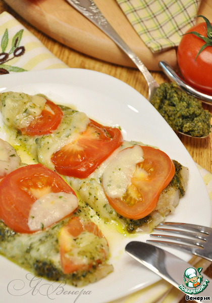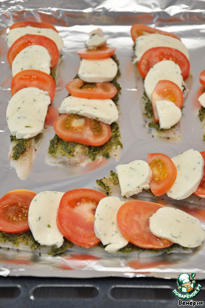 Выложить рыбу в форму, смазать песто, на песто положить нарезанные помидоры, запечь 10 минут, выложить моцареллу – и ещё на 5 минут в духовку.