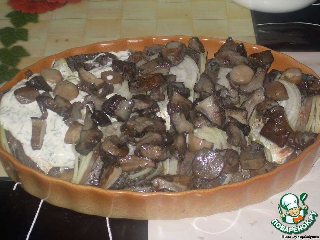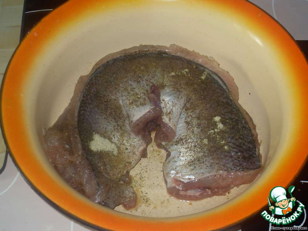 Итак, рыбу почистить, отрезать голову и плавники, выпотрошить и разделать на два филе с кожей. Косточки очень крупные и легко удаляются. Надо их вынуть. Половинки филе посыпать солью, перцем и приправой для рыбки, сбрызнуть лимонным соком или яблочным уксусом.
