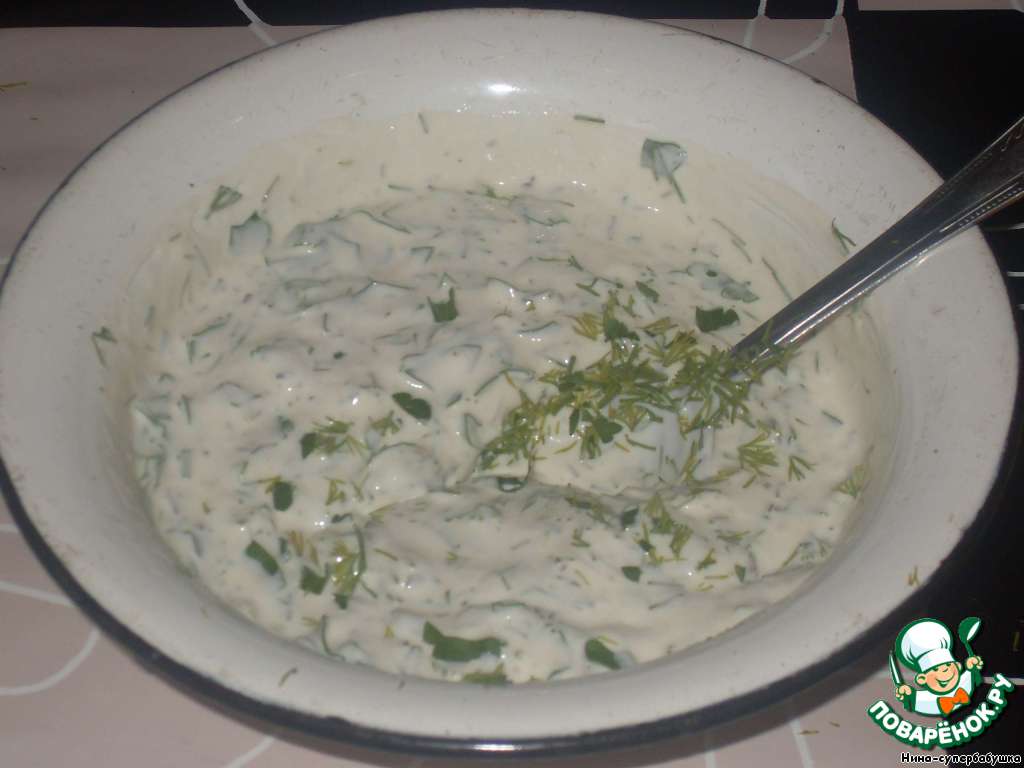 Майонез и сметану смешать, добавить мелко нарезанную зелень.