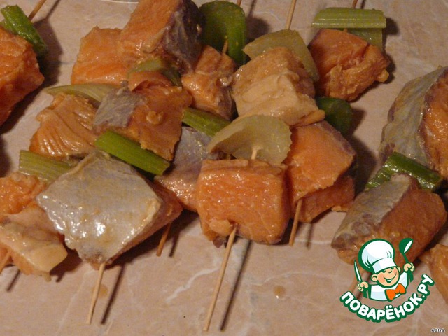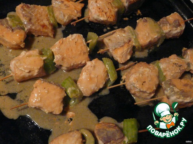 Нанизать кусочки семги и сельдерея на шпажки, положить на горячий противень, смазанный маслом. Жарить в духовке 10 -12 минут, поворачивая и часто поливая маринадом.