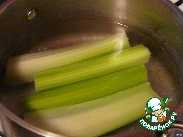 Сельдерей отварить в соленой воде 3 минуты, охладить под душем, нарезать на кусочки по 2-3 см.