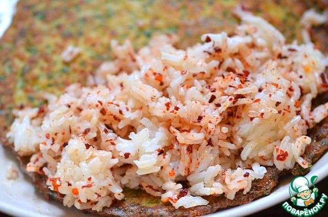 Пряный рис выложить на рыбную лепёшку с одной стороны.