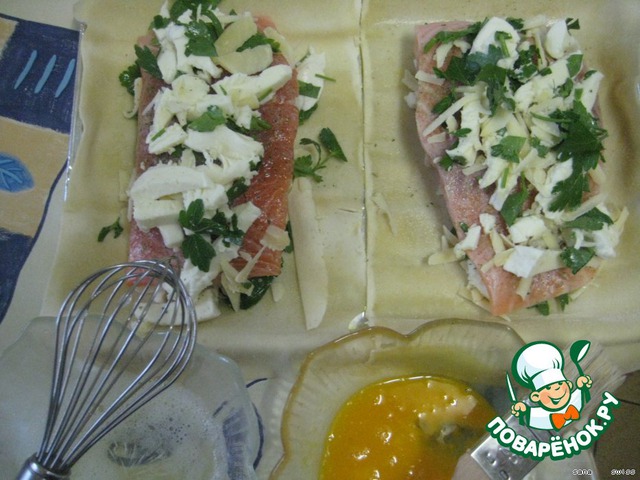 Посоленные и поперченные куски рыбы сбрызнем соком лимона и выложим на куски теста, сверху выкладываем рикотту с зеленью, тесто заворачиваем, смазываем желтком.