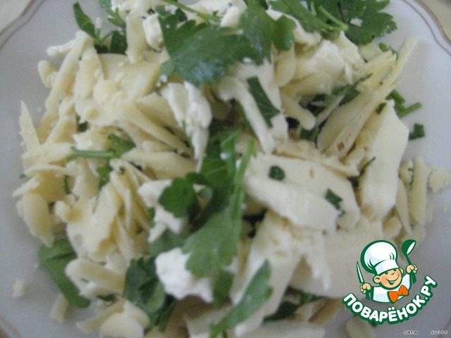 измельченную рикотту перемешать с натертым сыром и измельченной зеленью.