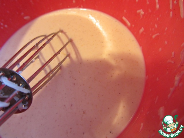 Для заливки смешаем сливки, молоко, яйца и тертый сыр. Приправим солью, чёрным молотым перцем, молотым кайенским перцем и тёртым мускатным орехом.