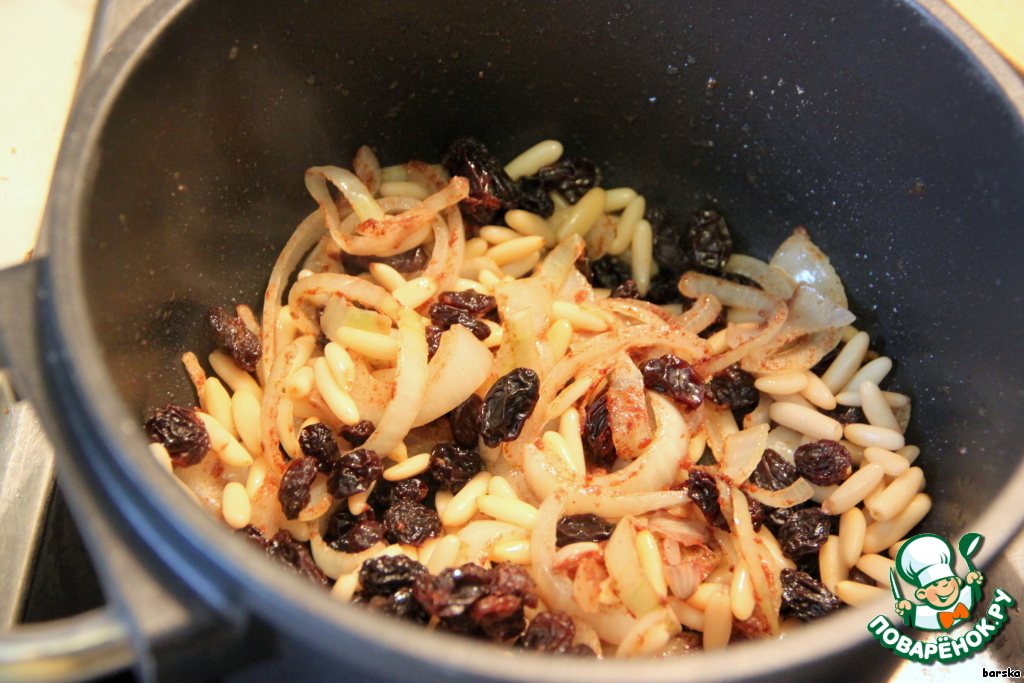 Добавить изюм (без косточек) и орешки. Посолить и поперчить. Снять с плиты. Дать остыть.