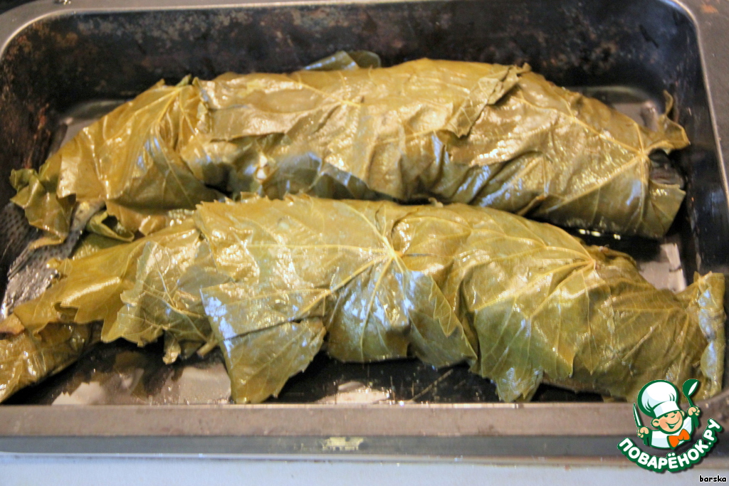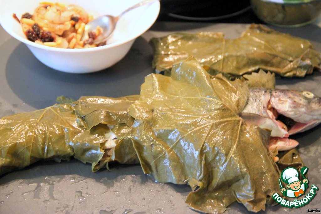 Я запекала в духовке. Смазать противень маслом, выложить рыбу и запекать при 180*С около 20 минут (виноградные листья должны слегка подрумяниться, но не высохнуть)
