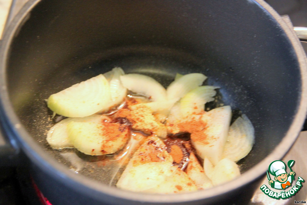 Луковицу нарезать полукольцами. Разогреть масло и потушить лук на медленном огне 3-5 мин.