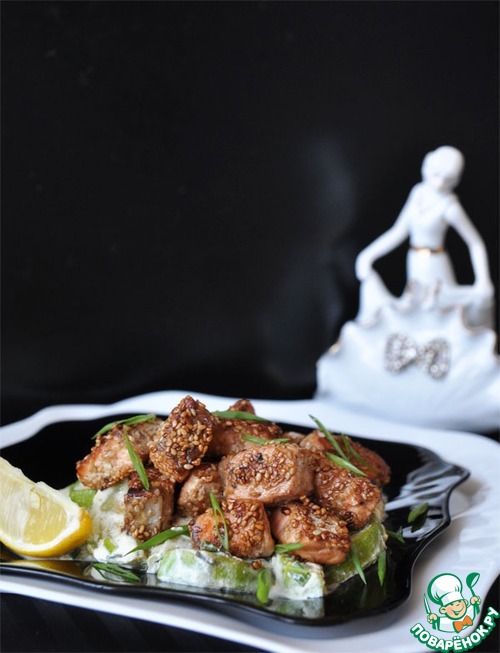 Сверху кладём поджаренный лосось. Подаём с ломтиком лимона. Посыпаем перьями зелёного лука.