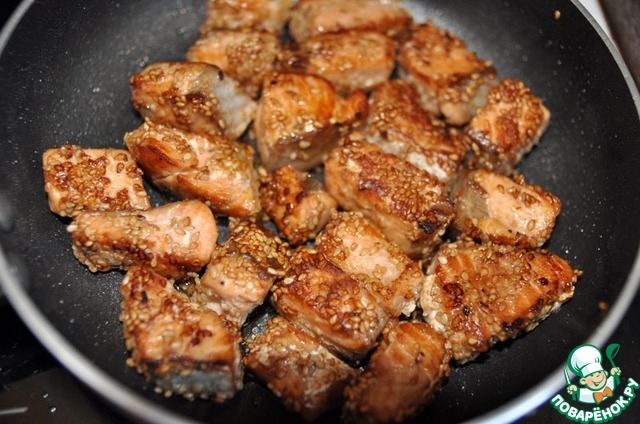 Рыбу засыпаем кунжутом так, чтобы все кусочки равномерно были покрыты семенами. Кунжут должен "прилипнуть" к рыбе.