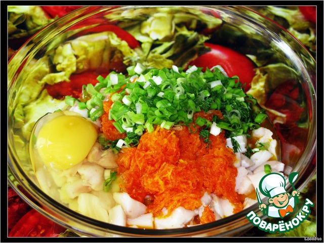 В нарезанное филе добавить яйцо, жареную морковь и мелко нарезанную зелень.