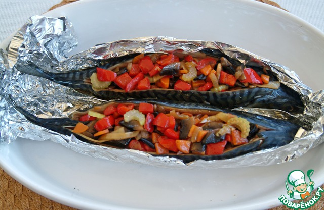 Из фольги сделать две "лодки". Это не даст рыбе потерять форму во время запекания. Смазать фольгу оливковым маслом. Наполнить рыбу овощами, выложить брюшком на фольгу. Запекать при 180* около 30 минут. Перед подачей посыпьте рыбу тертым пармезаном. Подавать с лимоном.