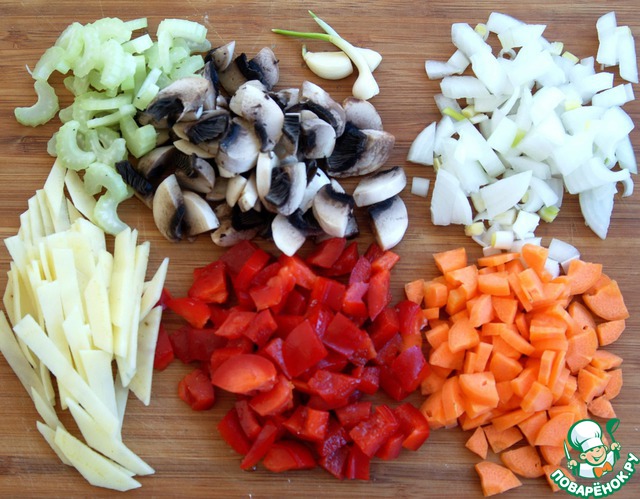 Обжарить на оливковом масле сначала картофель 3 минуты, добавить к нему лук. Через 3 минуты добавить болгарский перец, спустя 2-3 минуты грибы. В самом конце добавить сельдерей и раздавленный чеснок. Посолить, поперчить. Спустя минуту чеснок выбросить. Сельдерей должен остаться хрустящим.