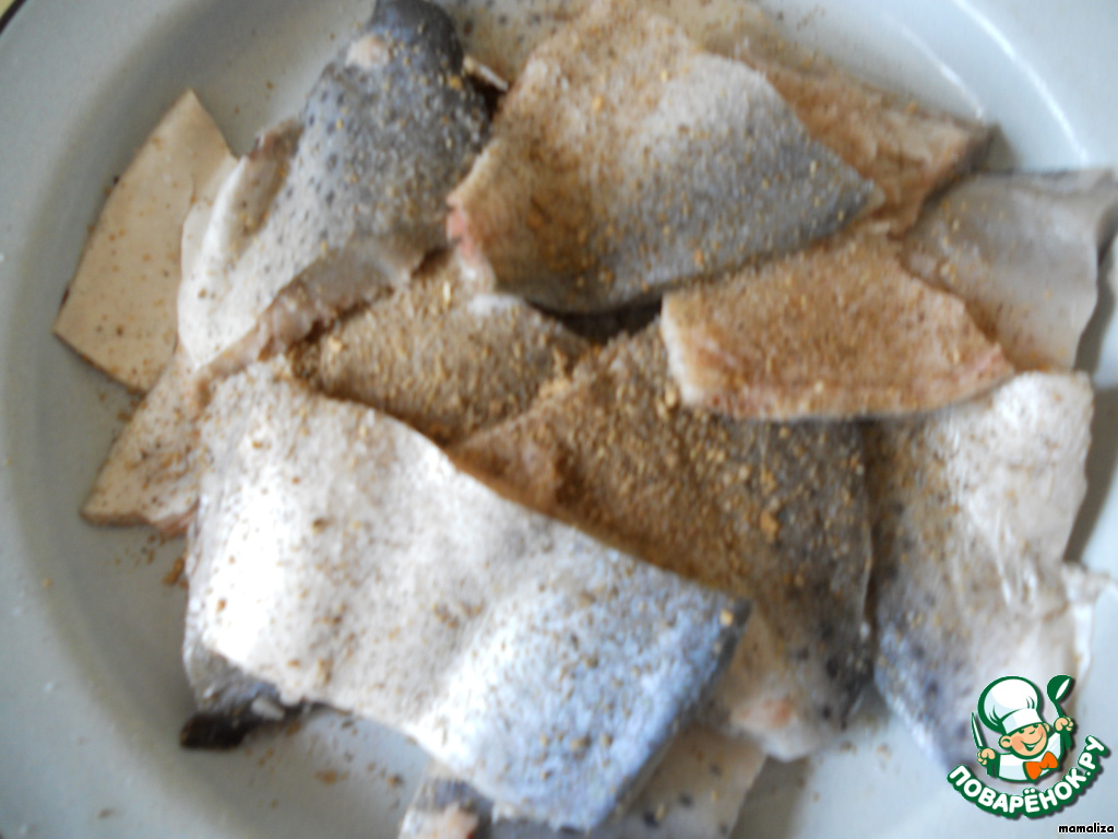 Рыбу почистить, срезать голову, хвост и плавники. Острым ножом надрезать рыбу вдоль хребта с двух сторон и отделить филе. Каждое филе разрезать на 3 части. Порционные куски посолить и приправить специями.