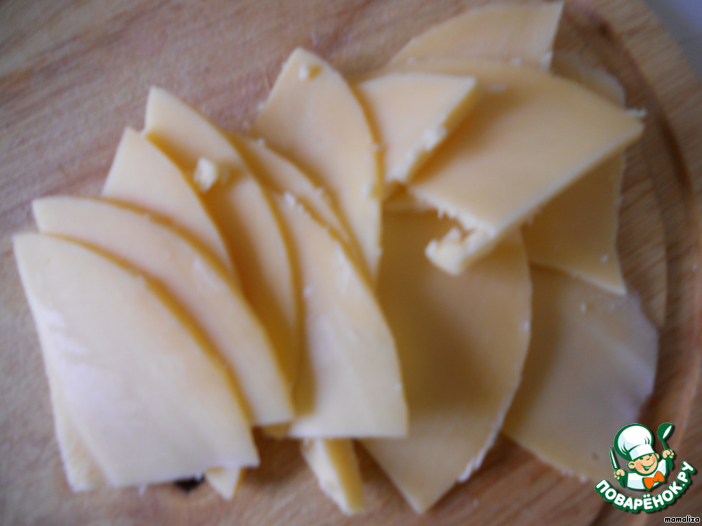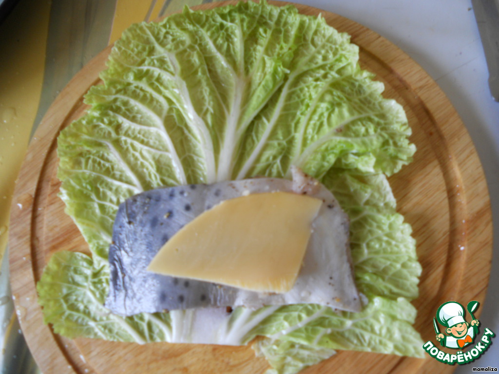 На каждый отбитый капустный лист положить кусок рыбы и пластинку сыра.