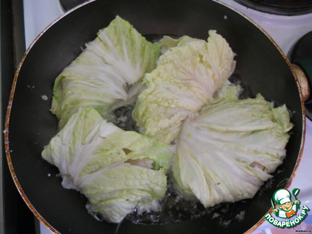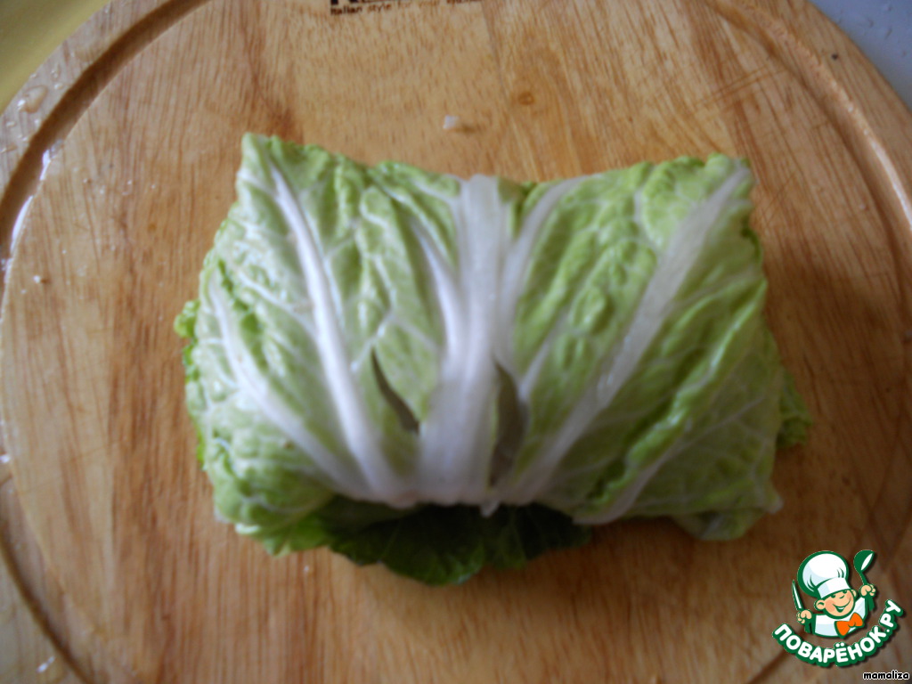 Отрезать 12 капустных листов (верхнюю часть). На каждом листе срезать утолщение и слегка отбить деревянным пестиком.