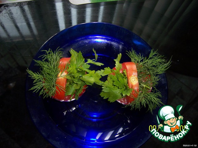 В каждую корзиночку нальем этого соуса и воткнем туда зелень, чтоб получились вот такие корзинки. Уберем пока в холодильник