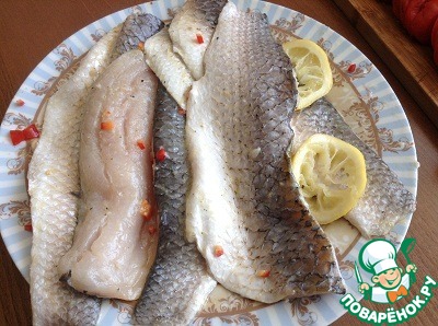 Для начала немного подмаринуем рыбку - филе солим, посыпаем перчиком чили (по желанию), поливаем соком лимона и оливковым (растительным) маслом.
