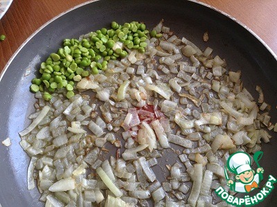 Выливаем в сковороду примерно половину стакана воды (до уровня гороха) и ставим на огонь.