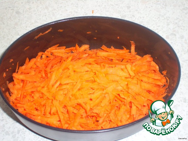 Обжаренную рыбу выложить на противень, посыпать луком, поперчить, посыпать морковью.