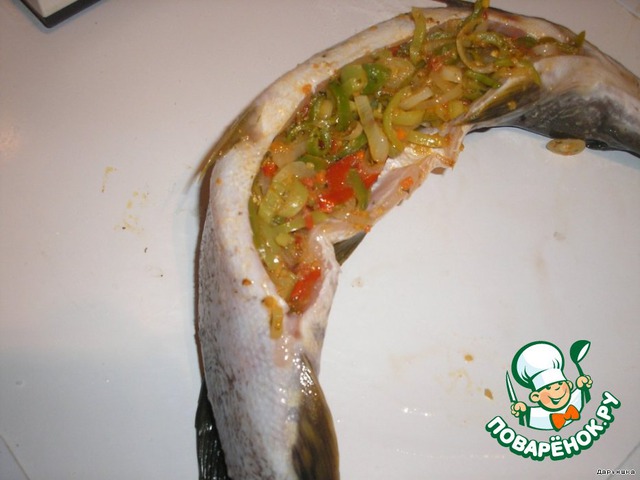 Щуку натереть солью и перцем внутри и снаружи. Во внутрь положить овощи.