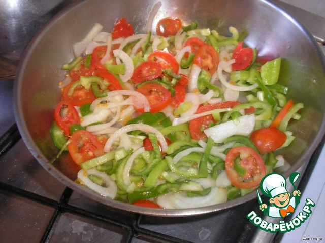 Болгарский перец порезать соломкой, лук - полукольцами, помидоры - кольцами.