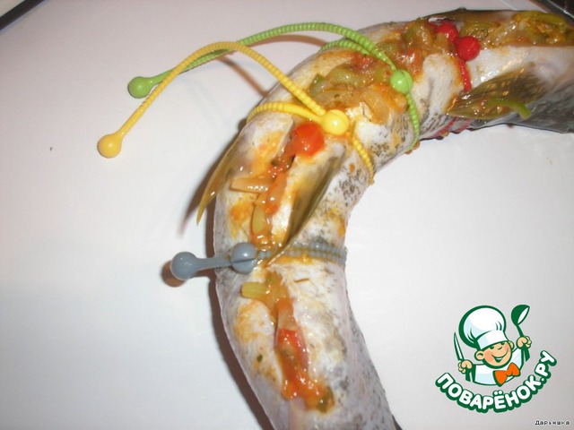 Закрепить пузик у рыбки, чтобы начинка не выпала. Я использовала для этого петли для завязывания продуктов. Про них в форуме написано: http://forum.povarenok.ru/viewtopic.php?t=252&start=30