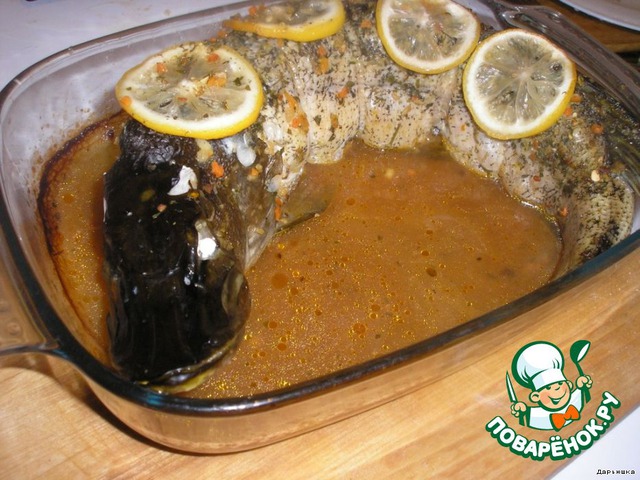 Затем я рыбку положила в форму, посыпала сверху обильно специями для рыбы и положила дольки лимона. Форму с рыбой поместила в пакет для запекания. И на 40 минут - в духовку при температуре 200 градусов.