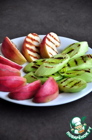 Яблоки и лук-порей помыть, обсушить. Яблоки разрезать на шесть частей, удалить сердцевину. Лук-порей нарезать до темной зеленой части. Обжарить лук и яблоки на сковороде-гриль до появления полосочек.