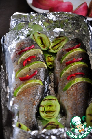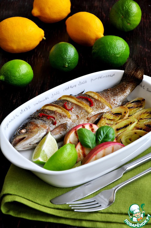 Лимон или лайм разрезать на две половины, одну половину нарезать. Рыбу несколько раз надрезать с одной стороны до хребта. В каждый надрез вложить по половинке лимона или лайма. Посыпать кориандром, смазать растительным маслом, сбрызнуть вином.
