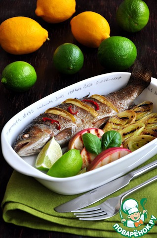 Из фольги сделать квадратную форму с бортиками. Уложить в нее рыбу. В брюшко рыбе положить по зубчику чеснока, красный острый перец по вкусу и немного молотого кориандра. Рядом с рыбой выложить лук-порей и яблоки. Их тоже сбрызнуть вином и маслом растительным. Чуть посолить и поперчить. Запекать при 200* - 20 минут.