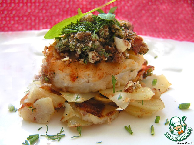 Рыбные медальоны под ореховым крамблем на хрустящей картофельной подушке