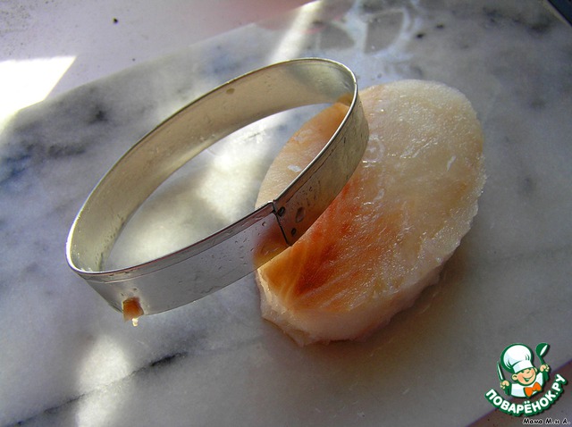 Из рыбного филе вырезать медальоны (или взять готовые). Я нарезала выемкой для большого печенья.