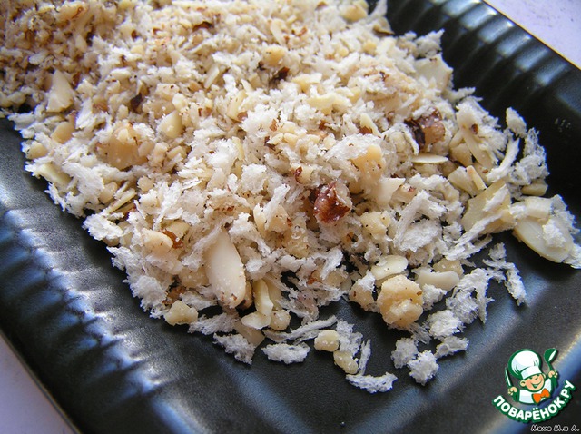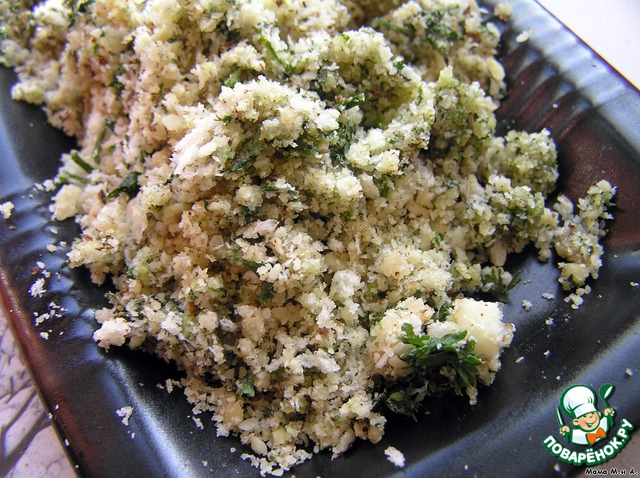 Мелко режем петрушку и чеснок. Добавляем прованские травы, чеснок с петрушкой в орехово-хлебную крошку и смалываем до соединения. Получается хоть крошковатая, но масса.