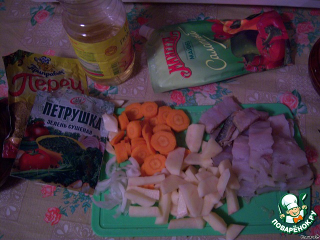 Подготавливаем продукты:Лук режем полукольцами,морковь-кружочками,рыбку на кусочки,картофель дольками,чеснок давим