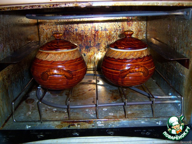 Через 30 минут достаем горшочки,доливаем немного воды и, без крышечек, ставим обратно в духовку на 10 минут. Приятного аппетита!!!