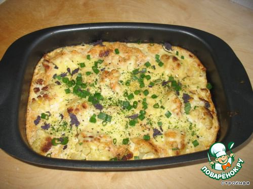 Противень смазываем жиром, на донышко выкладываем половину жаренной капусты, потом рыбку, сбрызгиваем ее соком половинки лимона и сверху выкладываем оставшуюся капустку. Натираемым сырочки, равномерно по всему противню и делаем "сеточку" из майонеза. В нагретую до 200 градусов духовку помещаем рыбку на 15 минут. Потом, на 5 мин. включаем гриль, а если нет-просто температуру повышаем, чтобы корочка красиво запеклась. Перед подачей посыпать зеленью. Рыбочка получается мягенькая, сочная и во вкусненькой "упаковочке"))). Буду рада, если мой рецепт кому-то понравится. Приятного Вам аппетита!!!