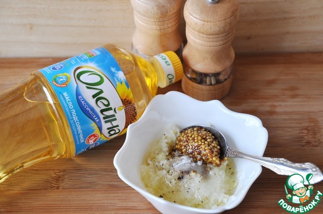 Готовим луковый маринад. Добавляем к измельчённой массе подсолнечное масло "Олейна", горчицу с зёрнами, молотый кориандр, соль и свежемолотую смесь перцев, перемешиваем.