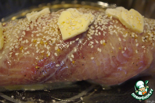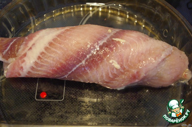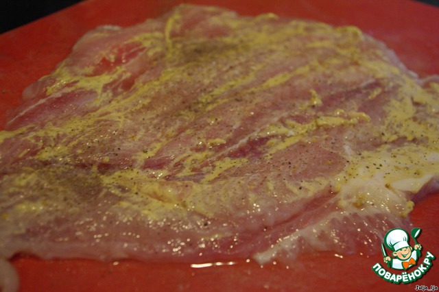 Итак, филе пангасиуса (у меня было не замороженное, а охлаждённое, замороженное - разморозить), разрезаем там, где это возможно (нужно судить по толщине и форме филе), вдоль, чтобы получился один общий пласт рыбы, который мы будем сворачивать в рулет. Смазываем его 1 чайной ложкой горчицы, солим и перчим по вкусу. Оставляем пропитаться минут на 10.