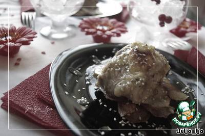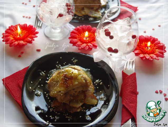 Пикантный рулет из белой рыбы с шампиньонами, сыром и кедровыми орешками под горчично-медовым соусом
