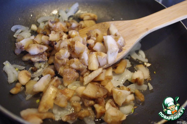 Добавляем нарезанные шампиньоны. Обжариваем, пока не выпарится вся жидкость и шампиньоны немного не подрумянятся. Солим и перчим по вкусу.