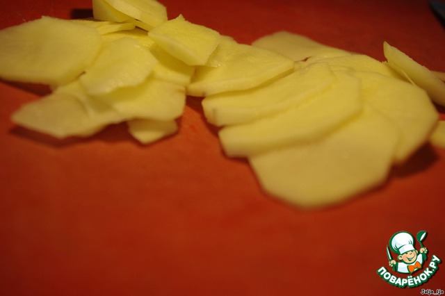 Картофель очищаем, нарезаем тоненькими ломтиками. Кладём в холодную воду.