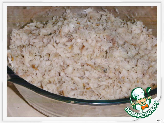 Отваренную рыбу разобрать на мелкие кусочки.