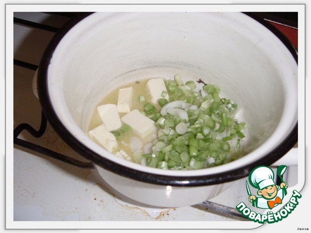 В небольшую кастрюльку положить слив.масло,лук.Тушим на огне до готовности 15-20 мин(лук должен быть мягким и прозрачным).