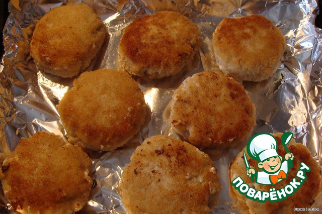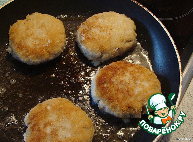 Слепить котлеты (у меня из килограмма рыбы получилось 8 толстеньких котлеток), обвалять в панировочных сухарях, СЛЕГКА обжарить их с двух сторон на растит.масле