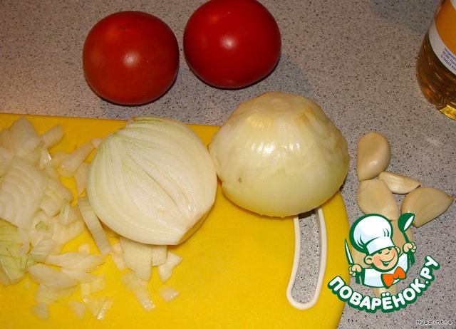 Пока котлеты обжариваются, нарезать лук, чеснок, помидоры.
